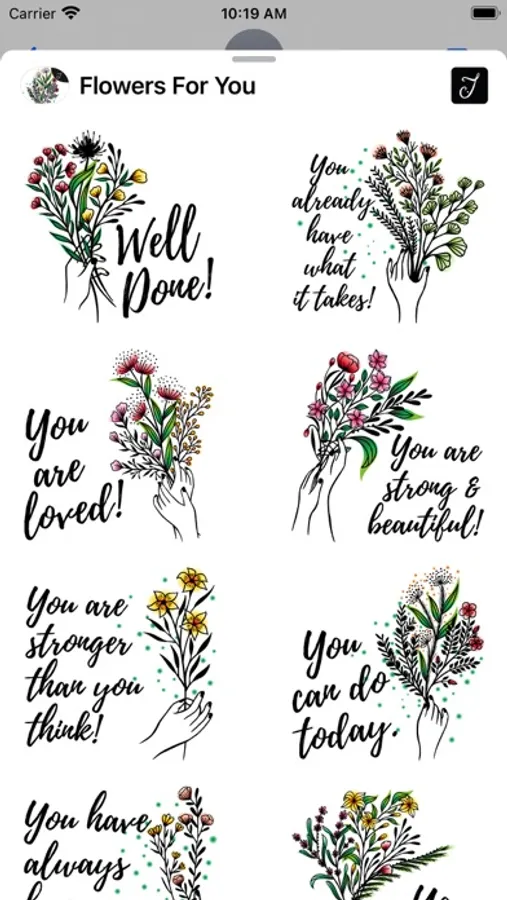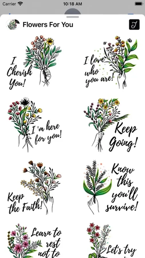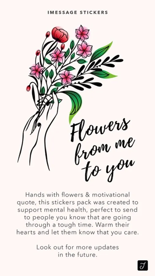 Hands with flowers & motivational quote, this stickers pack was created to support mental health, perfect to send to people you know that are going through a tough time. This iMessage sticker pack comes with 33 stickers ready for you to use, a combination of hands with flowers and encouraging quote and hands with flowers only, so you can send your own thought with it.