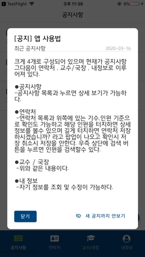 새로운 공지사항이 나오면 팝업으로 앱 진입시 나오는 기능
