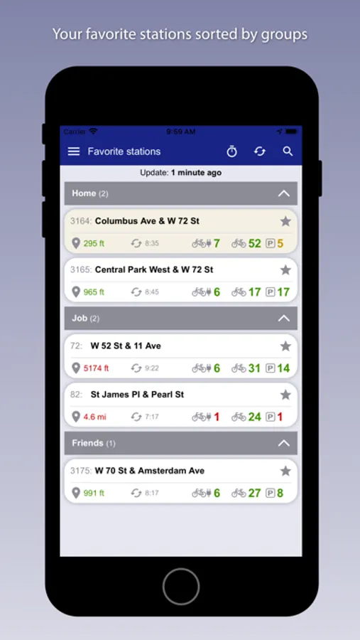 - List of favorite stations categorized by groups (home, work, friends or general).