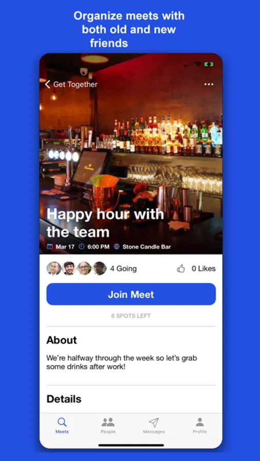 Meets can be public, private, online, in-person, with old friends, new friends, family gatherings, large events, small meetups… whatever you can dream of! Organize a study session with your classmates, a work lunch or happy hour with your coworkers, a family Christmas party, or just a night out on the town with some new friends. Meets are simple and flexible to suit your needs.