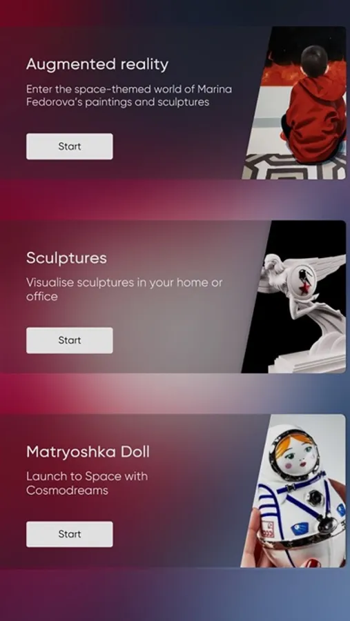 Ms. Marina Fedorova’s paintings featuring the augmented reality function can be found at cosmodreams.com, at the СOSMODREAMS exhibition, as well as in the exhibition catalogue.