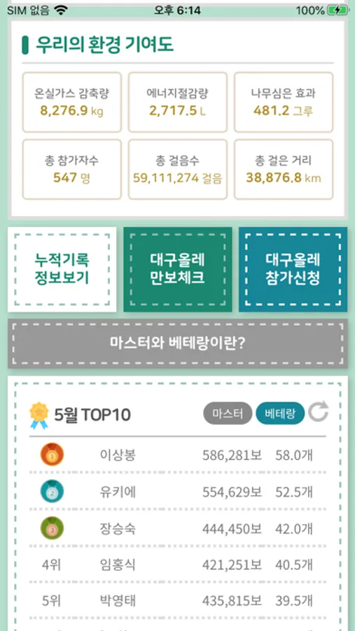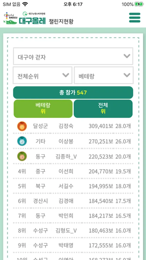 - 대구올레 메달 개수에 따라 랭킹이 표시됩니다.