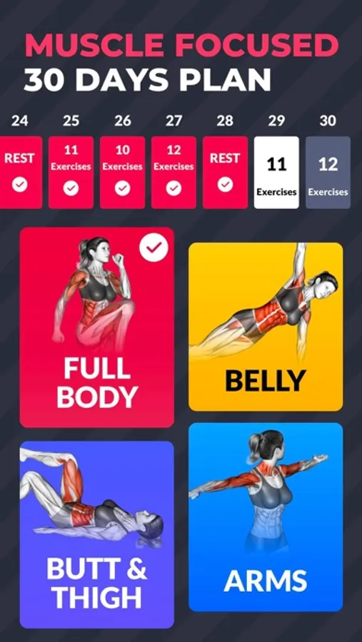 Women fitness app has belly fat burning workouts, butt workout for women, arm workout for women, leg workout for women and core workout. The belly fat burning workouts, butt workout, arm workout, leg workout and core workout are effective.