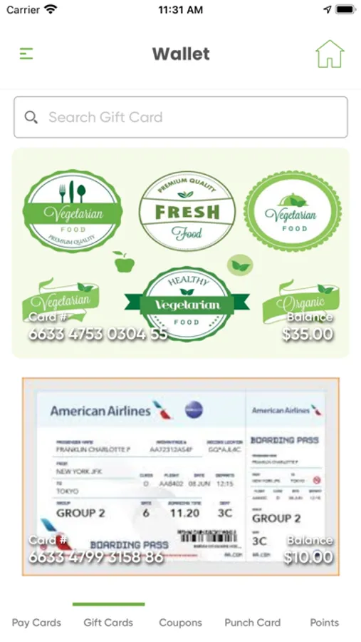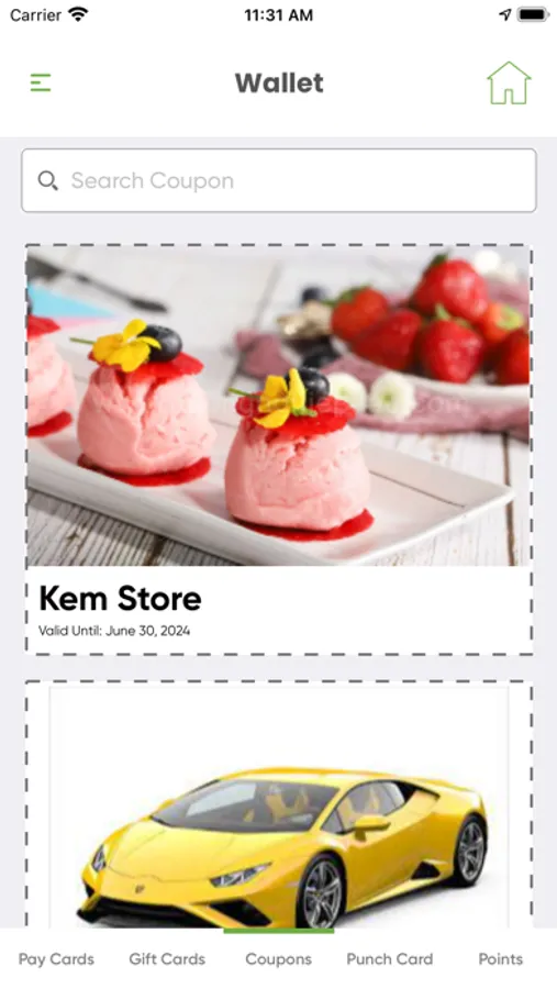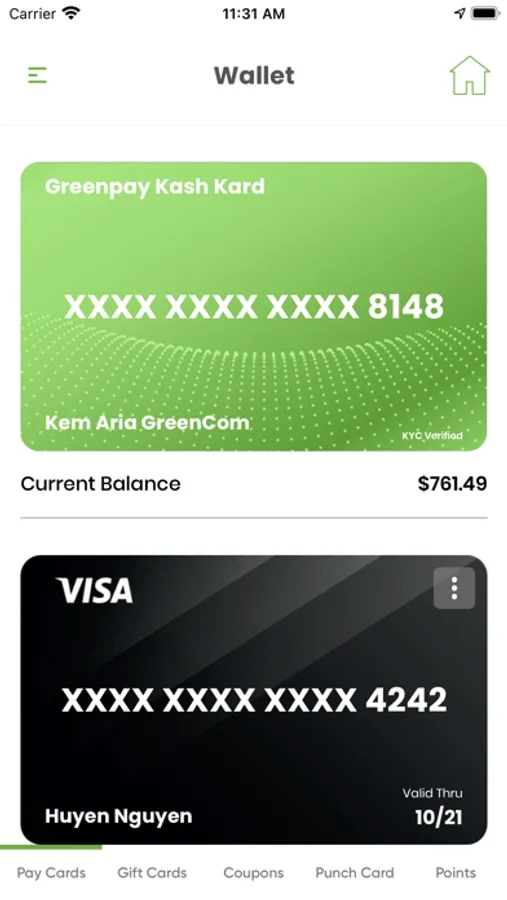 · Store gift cards, Coupons, Punch cards, and Cashback for quick access in the Greencom app.