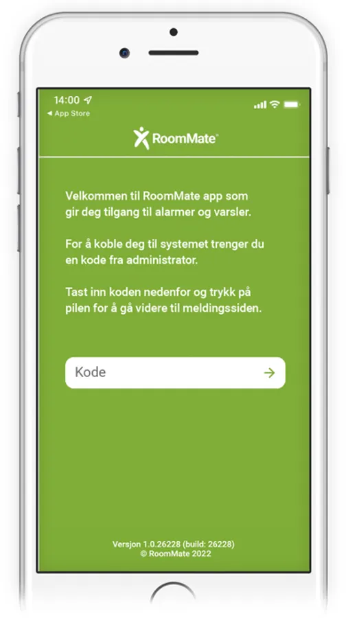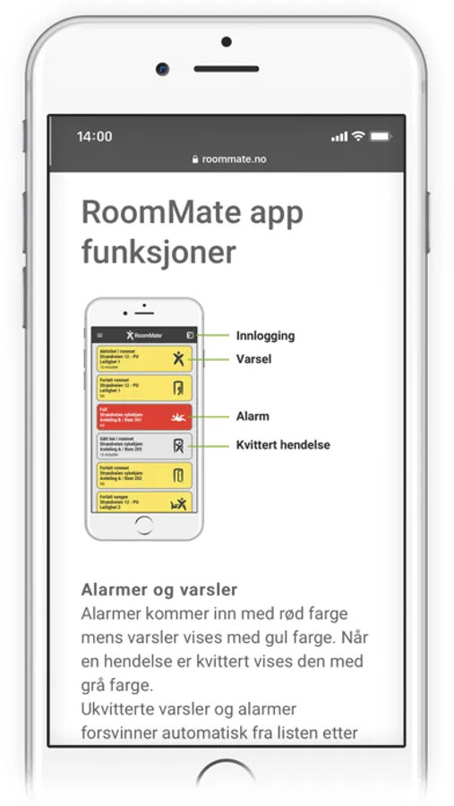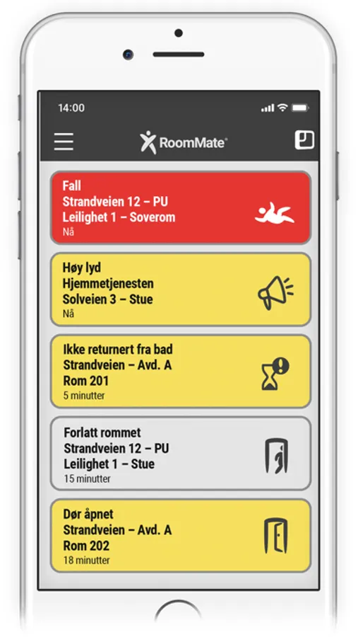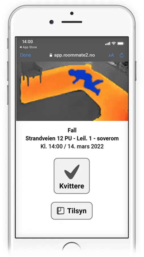 Med RoomMate-appen kan du motta alarmer og varsler fra RoomMate-systemet. Det er også mulig å gjennomføre anonymisert visuelt tilsyn.