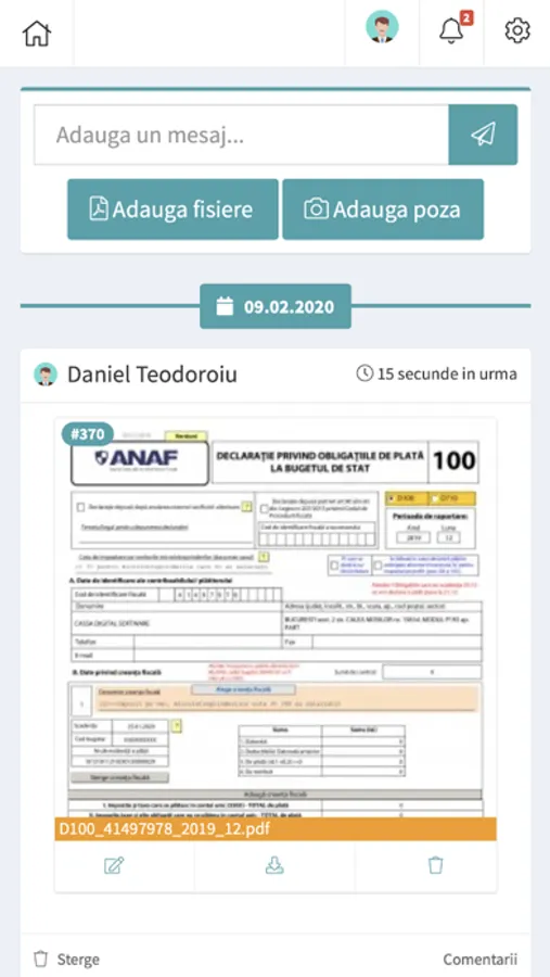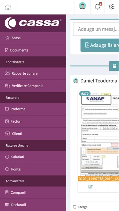 Stocarea documentelor, cu 3 categorii pentru filtrare și căutare rapidă după conținutul fișierului: documente contabile, de resurse umane și specifice companiei (certificat de înregistrare, act constitutiv)
