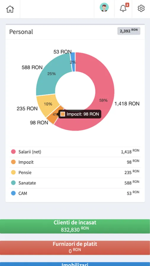 Aplicația cuprinde 4 module principale: panoul de lucru, facturare, HR admin, autoservire.