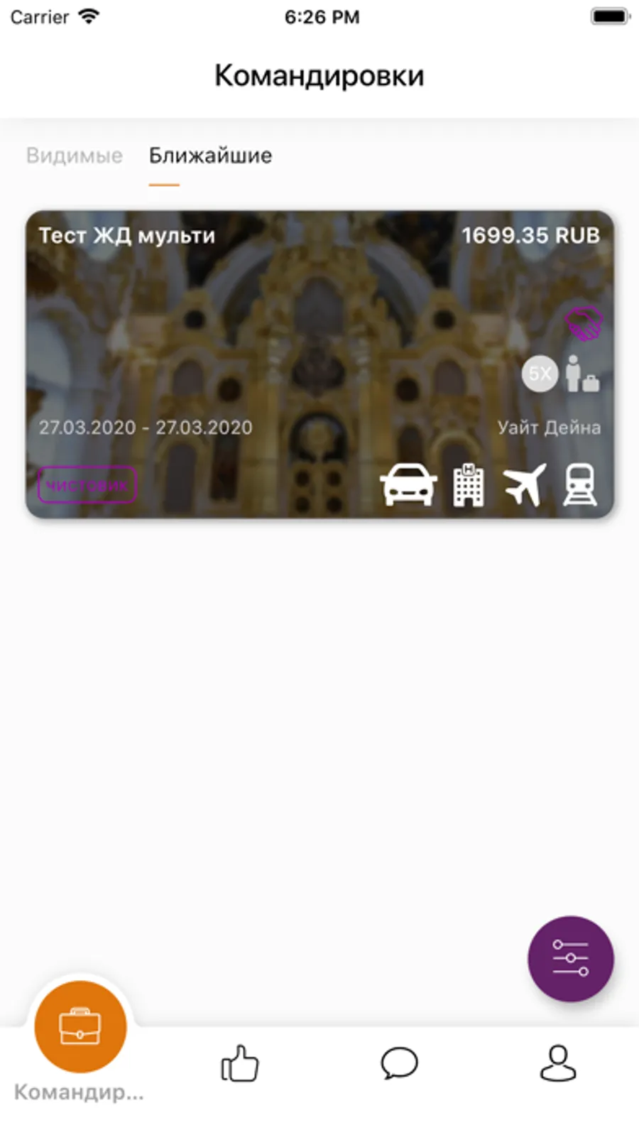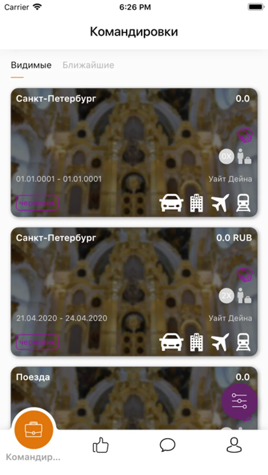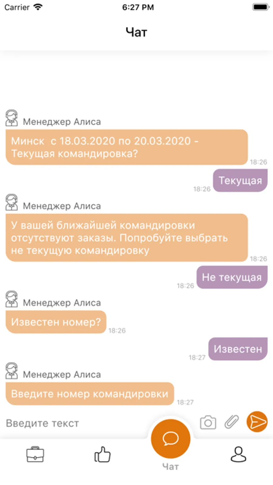 Включает в себя просмотр всех доступных командировок, ближайших командировок, авторизацию командировок и чат бот.