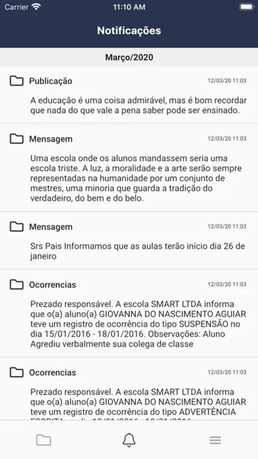 Avisos, ocorrências escolares, declaração de pagamentos, enfim....