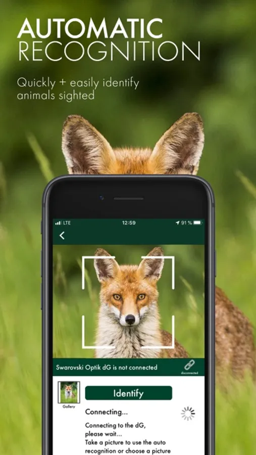 In combination with the SWAROVSKI OPTIK dG, the free SWAROVSKI OPTIK Wildlife ID app enables the automatic identification of a total of 100 mammals, 200 butterflies and 50 dragonflies that can be observed in the wild across Europe. Capture your experiences as photos or share your discoveries via livestream.