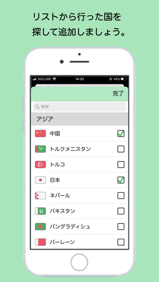 リストから追加するだけで、今までに旅した国や都道府県の数がカウントされ、世界中の国々の何%を訪れたか、日本の都道府県の何%を訪れたかを、ひと目で確認できるオリジナルの地図ができます。