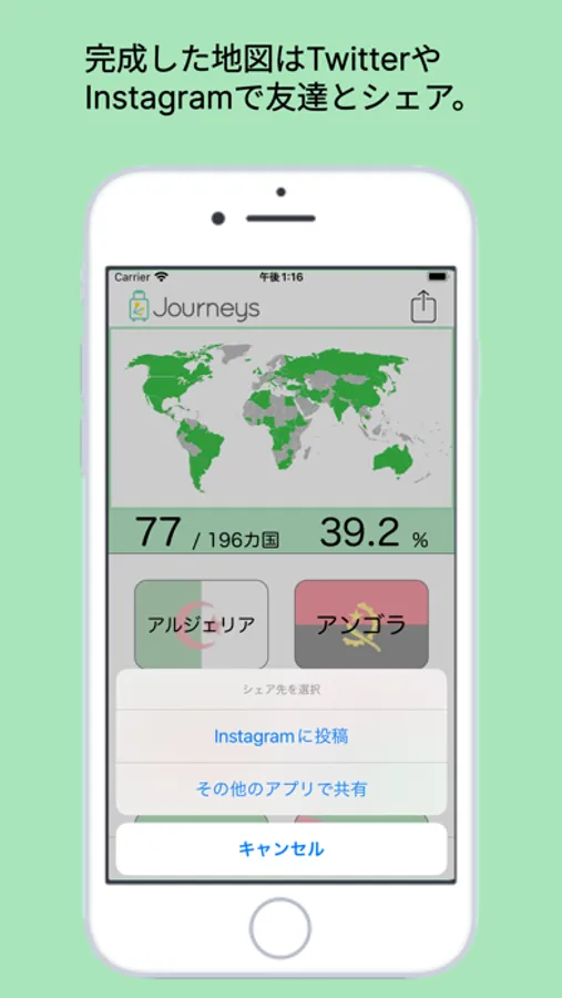 また、できあがった世界地図・日本地図は、InstagramなどのSNSで友達にシェアすることや画像として保存することができます。