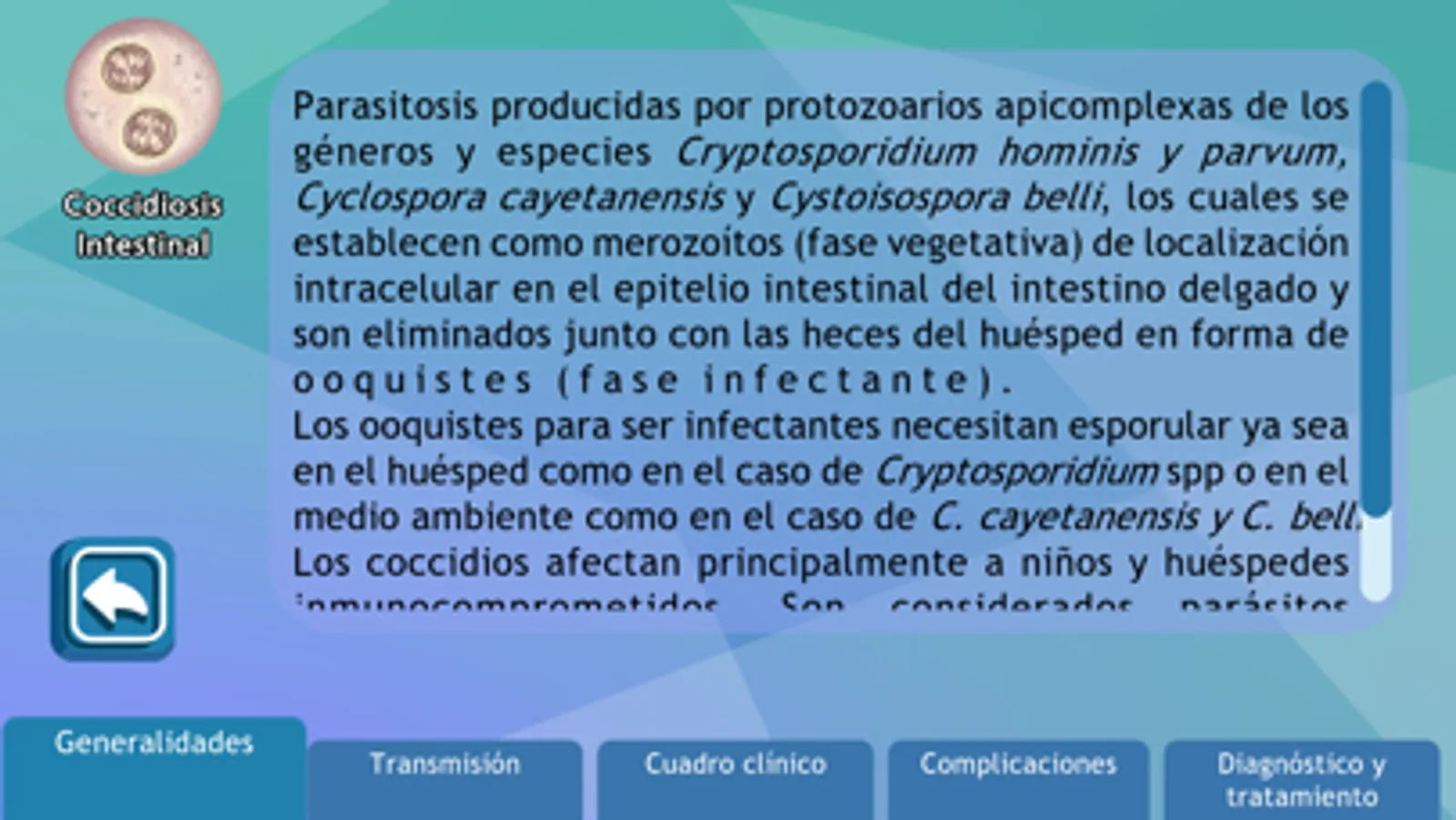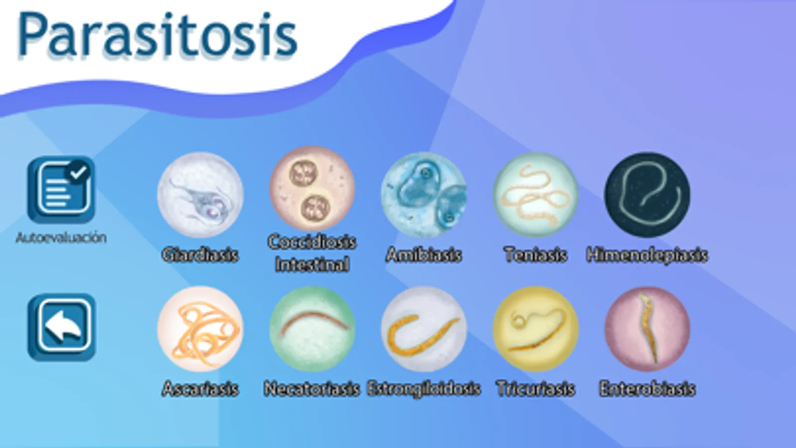 Enteropara-site es una aplicación que contiene material didáctico multimedia para el estudio de las parasitosis de importancia médica que afectan el intestino delgado y grueso que se incluyen en la unidad temática de Parasitología de la asignatura de Microbiología y Parasitología del segundo año de la carrera de Médico Cirujano de la Facultad de Medicina de la UNAM. Incluye información referente a las generalidades de las parasitosis, mecanismos de transmisión, cuadro clínico, diagnóstico y tratamiento. Esta app debe de utilizarse únicamente como herramienta de estudio para reforzar el conocimiento adquirido en clase ya que la información es solo un resumen de la cátedra de cada parasitosis. Los temas incluidos en la app son: Giardiasis, Coccidiosis intestinal, Amibiasis, Taeniasis, Hymenolepiasis, Ascariasis, Necatoriasis, Strongyloidosis, Trichuriasis y Enterobiasis. El usuario debe comprender que el contenido presentado en esta aplicación es únicamente de carácter informativo y diseñado para estudiantes de medicina, por lo que se debe de consultar a un médico cuando se padezca alguna de estas condiciones.