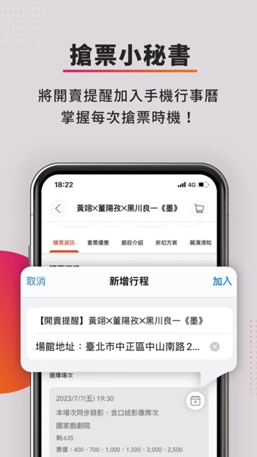 ▸ 專屬搶票秘書,設置行事曆提醒,掌握每次開賣時刻