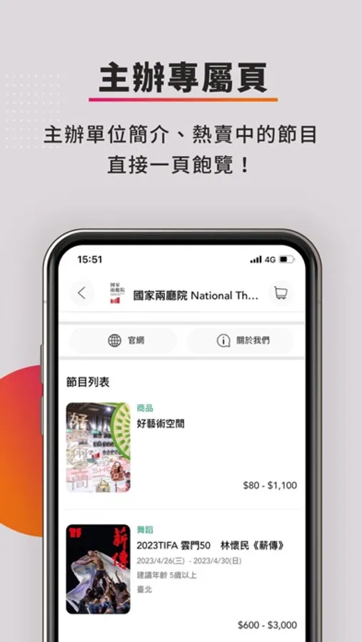 ▸ 主辦專屬頁面,一頁飽覽主辦單位簡介、熱賣節目
