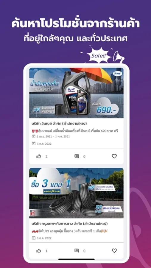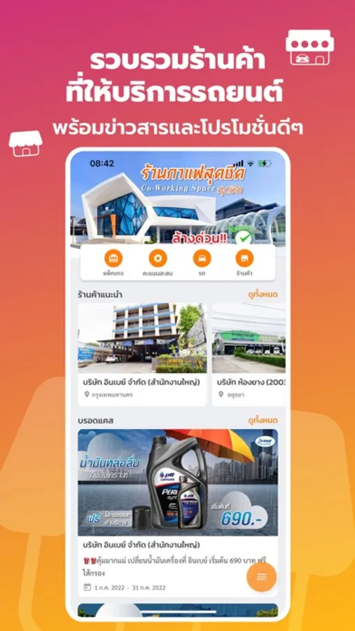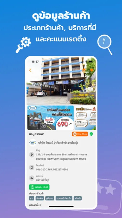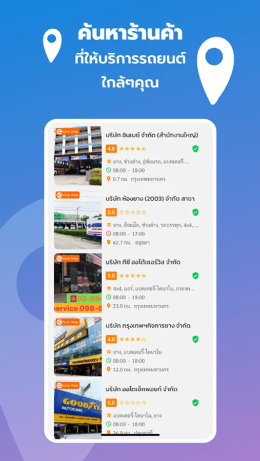 - สามารถค้นหาร้านค้าหรือโปรโมชั่น ที่อยู่ใกล้ๆ คุณ และสามารถกำหนดเงื่อนไขการค้นได้ เช่น ค้นหาร้านยาง, โปรโมชั่นน้ำมันเครื่อง แถวถนนพัฒนาการ เพื่อให้ได้ข้อมูลตรงความต้องการของคุณที่สุด และยังสามารถเข้าไปดูรีวิวงานซ่อม คะแนนเรตติ้งร้านค้าจากผู้ใช้บริการจริง เพื่อเป็นข้อเปรียบเทียบในการเข้ารับบริการจากร้านค้า