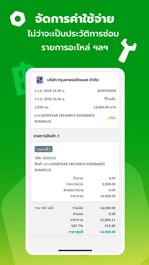 - ทุกครั้งที่ใช้บริการ ร้านค้าจะส่งประวัติการรับบริการให้คุณ โดยจะมีรายละเอียด เช่น วันที่, ชื่อร้านค้า, เลขไมล์ รวมถึงรายการอะไหล่ และค่าใช้จ่ายที่เกิดขึ้น และยังสามารถเพิ่มประวัติเข้ารับบริการได้ด้วยตนเองอีกด้วย