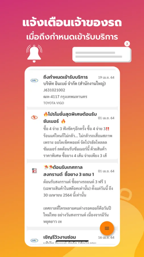 - รับแจ้งเตือนเมื่อถึงกำหนดเข้ารับบริการ เช่น ถึงกำหนดเปลี่ยนน้ำมันเครื่อง, เบรก, แบตเตอรี่, หัวเทียน, สลับยาง หรือเปลี่ยนยาง ทำให้เรื่องดูแลรถเป็นเรื่องง่ายๆ สำหรับคุณ