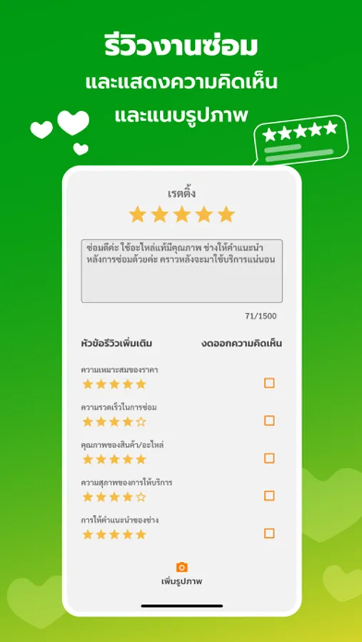 - เมื่อร้านค้าซ่อมเสร็จเรียบร้อย จะส่งรายละเอียดการซ่อมพร้อมเชิญให้คุณให้คะแนนงานซ่อม และแสดงความคิดเห็น