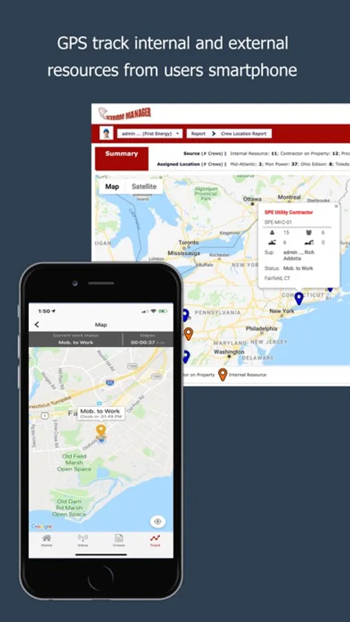 Storm Manager connects the impacted companies with their entire workforce both internal and external in real-time. Field based users use this mobile application to update their crew roster, track their time, submit their expenses, and get directions to their hotels.