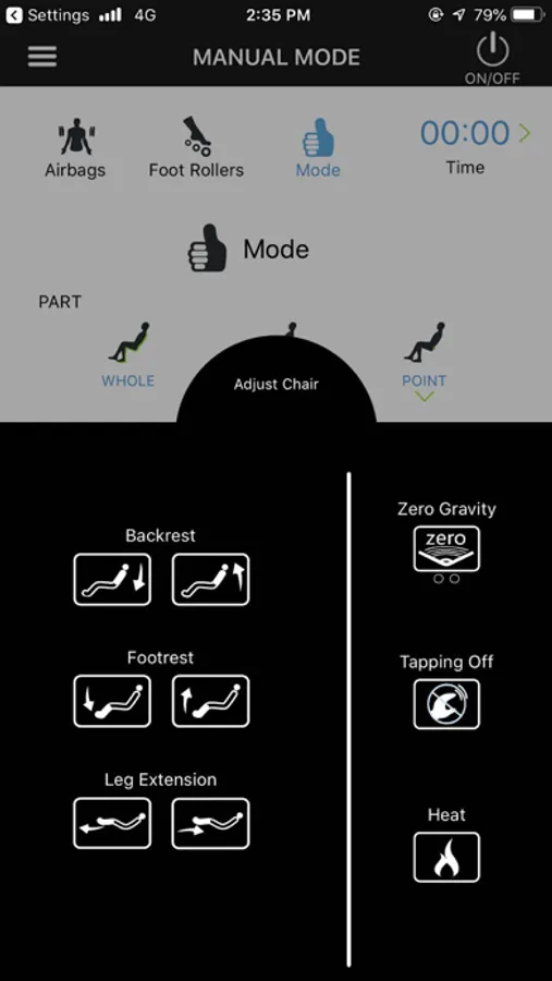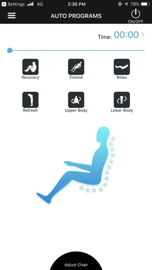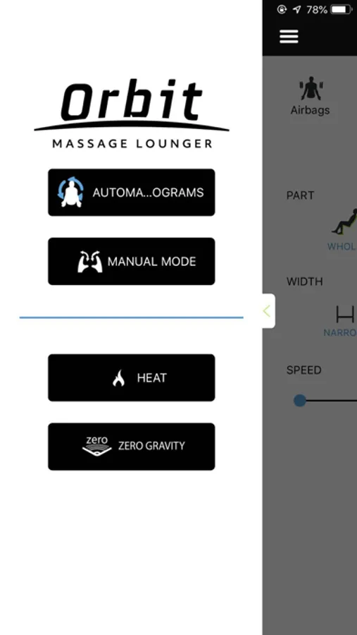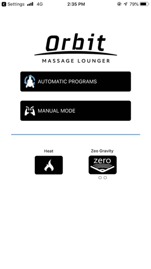 The Orbit 2D App connects wirelessly to your Orbit 2D massage chair using Bluetooth. Use the app to access the controls, including activating manual and automatic massage programs, targeting massage to different parts of your body, or varying the massage type and intensity.