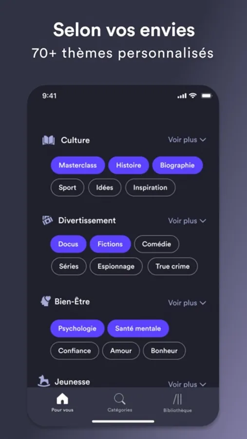 Sélectionnez parmi plus de 70 thèmes au choix et laissez-vous surprendre par une expérience d’écoute 100% personnalisée, pour toutes et tous !