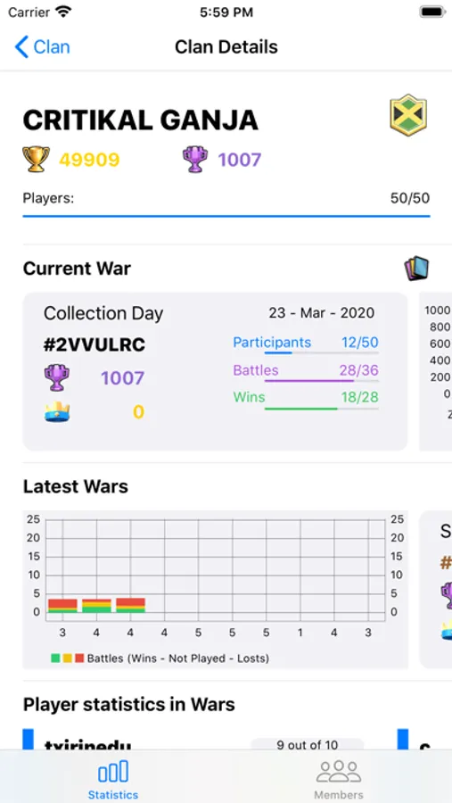 Monitor clan's performance for current war. You can check the number of Participants, Battles, Wins for the current war.See your personal stats including trophies, win/loss records, etc.