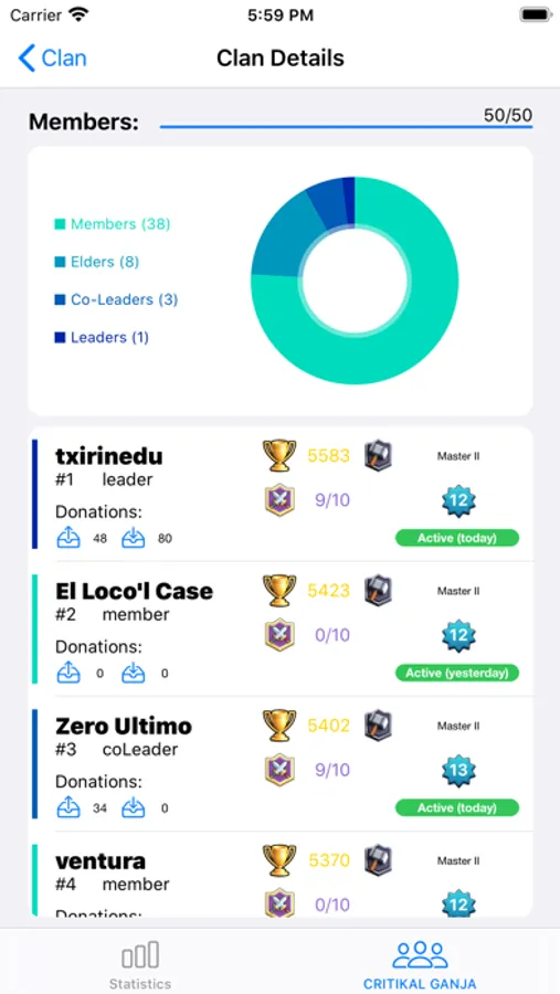 You can check the full list of players for the clan, grouped by role and in one sight you could know if the member is active, number of wars played, arena, experience level, trophies, donations...