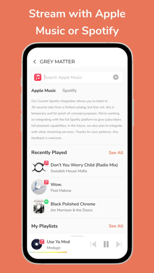 Tired of not being able to share music with friends because they use different streaming platforms? Tired of algorithms deciding what you should listen to? Grey Matter’s got you.