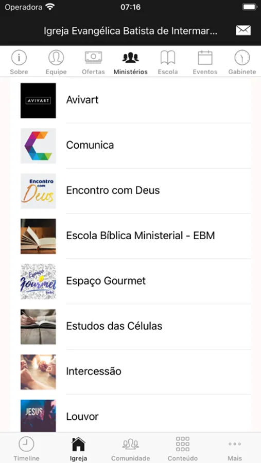 - Informações da Igreja (endereço, telefone, site, redes sociais, pastores)