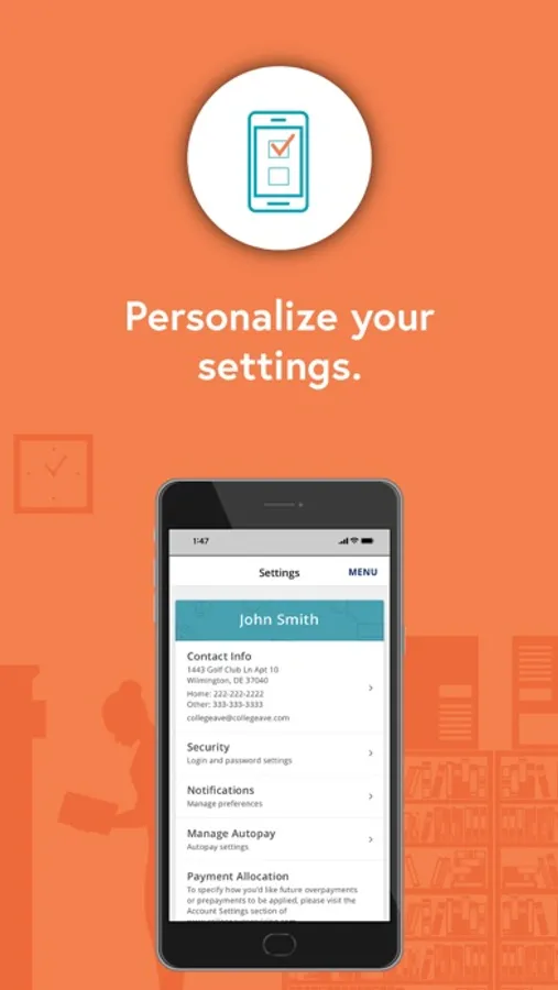 With the College Ave Student Loans App, you have secure access to your account from virtually anywhere. Check the status of your loan, make payments, manage AutoPay, update your contact info, and more. Plus, you can log into the app with Face ID and Touch ID.