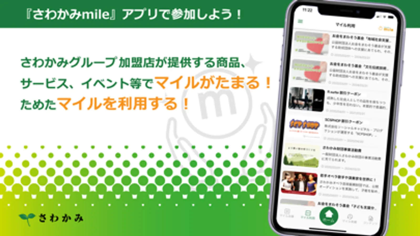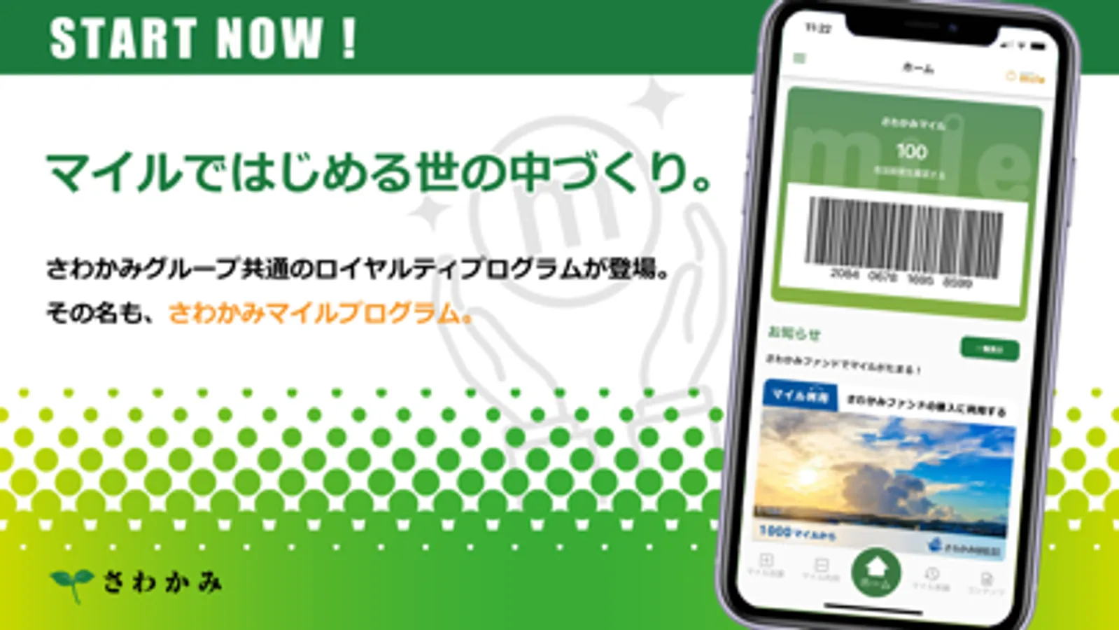 さわかみグループ共通のロイヤルティプログラムが登場。その名も、さわかみマイルプログラム。さわかみグループの加盟店が提供する商品、サービス、イベント等でマイルがたまる、ためたマイルを使える!無料アプリをダウンロードして参加しよう!