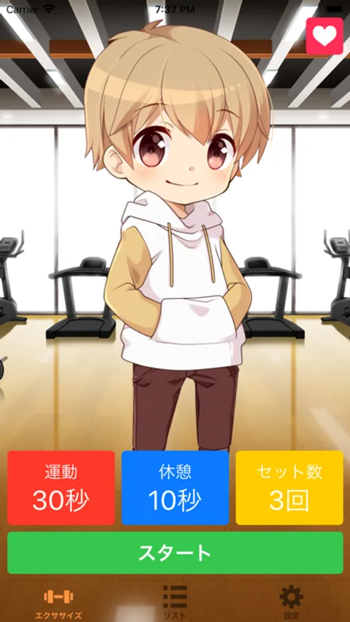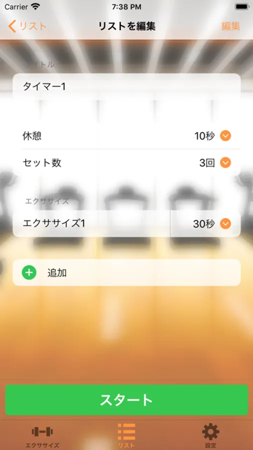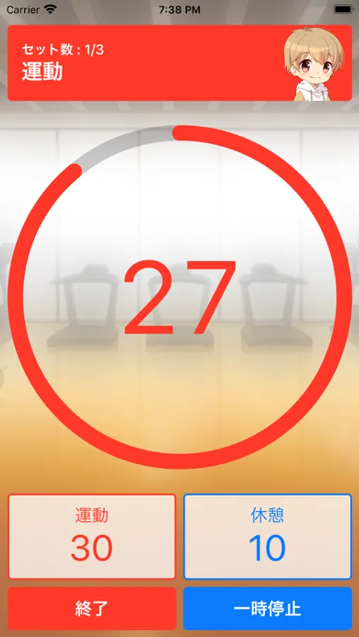 運動時間と休憩時間、セット数を選択してスタートボタンを押すとタイマーがスタートします。