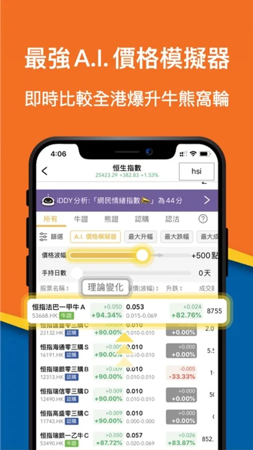「華富財經」聯同本地初創「iDDY愛投金融」專為窩輪牛熊愛好者而設的交易平台,集齊全港市面上所有輪證產品,除了提供大市策略及報價系統,更設有首創的「A.I.價格模擬器」幫您極速篩選爆升輪證,投資牛熊窩輪從此簡單!