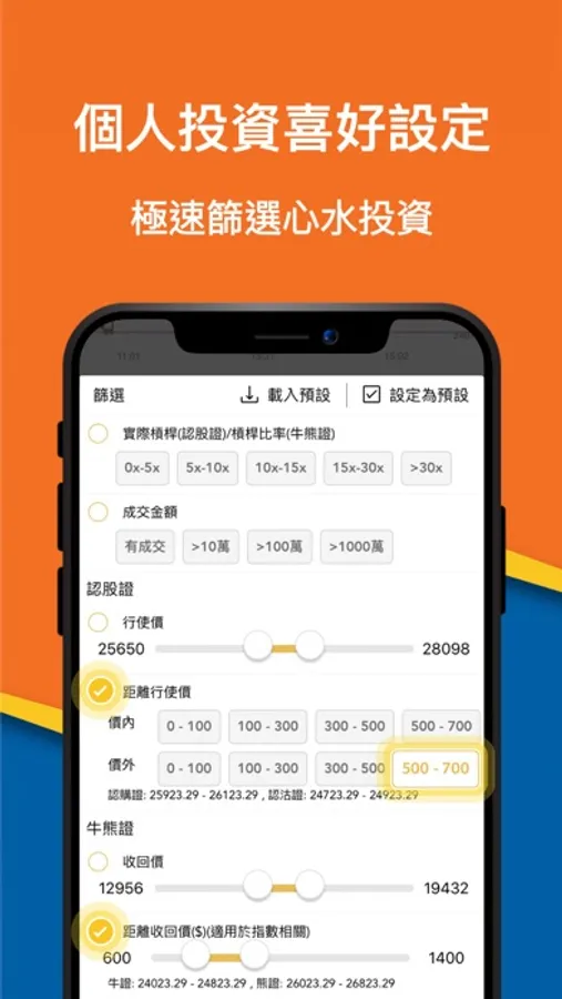 投資牛熊窩輪往往講求速度。透過儲存 「預設篩選設定」,可按個人策略條件風險,於每日眾多上市牛熊窩輪中,極速揀到您嘅心水,慳返每次篩選時間。