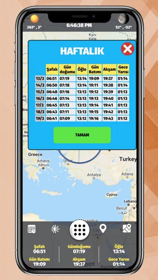 Güneş Takibi uygulaması ile anlık olarak yüksek hassasiyette ay ve güneşin konumunu takip edebilirsiniz. Şafak, Gün Doğumu, Öğle, Gün Batımı, Akşam ve Geceyarısı saatlerini kesin doğrulukta görebilir haftalık olarak bu saatleri tablo halinde izleyebilirsiniz.