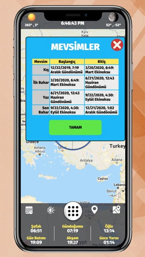 Mart Ekinoksu, Haziran Gündönümü, Eylül Ekinoksu ve Aralık Gündönümü tarih ve saatlerini yüksek hassasiyette tablo olarak sunar. Buna bağlı olarak mevsimlerin tarihlerini aktarır.