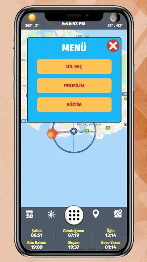 Anlık olarak Güneş ve Ay için Azimut ve Yükseklik açılarını sayısal ve harita üzerinde çember üzerinde gösterir. Bu şekilde kullanıcı güneş ve ayın anlık konumlarını harita üzerinde takip eder.