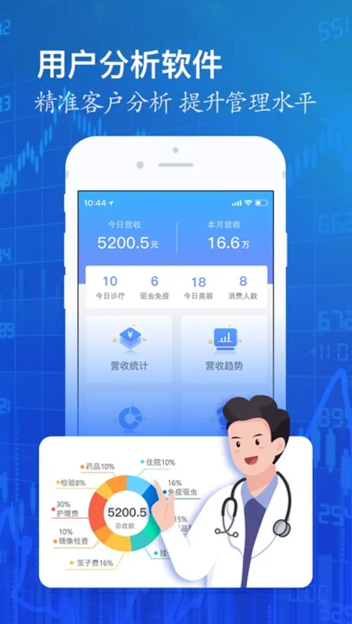 (1)营收统计分析:为宠物医院提供营收统计、营收趋势、服务统计、医师业绩、客户统计、VIP卡统计。