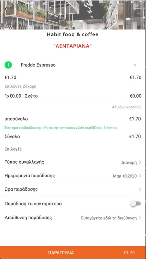 Για κάθε αγορά που κάνετε χρησιμοποιώντας το Habit Coffee app, αυτομάτως προστίθενται στο λογαριασμό σας πόντοι. Μόλις συμπληρώσετε 20 πόντους μπορείτε να τους εξαργυρώσετε στην επόμενη αγορά σας και θα έχετε έκπτωση 2€.