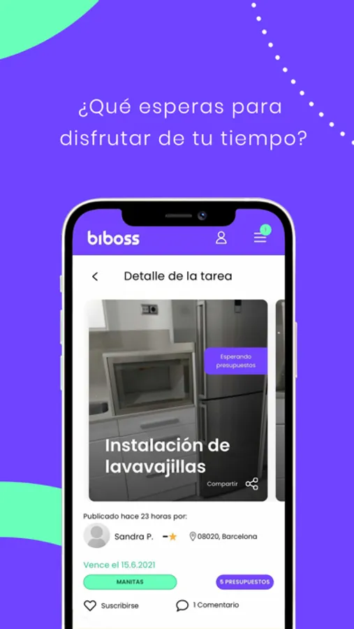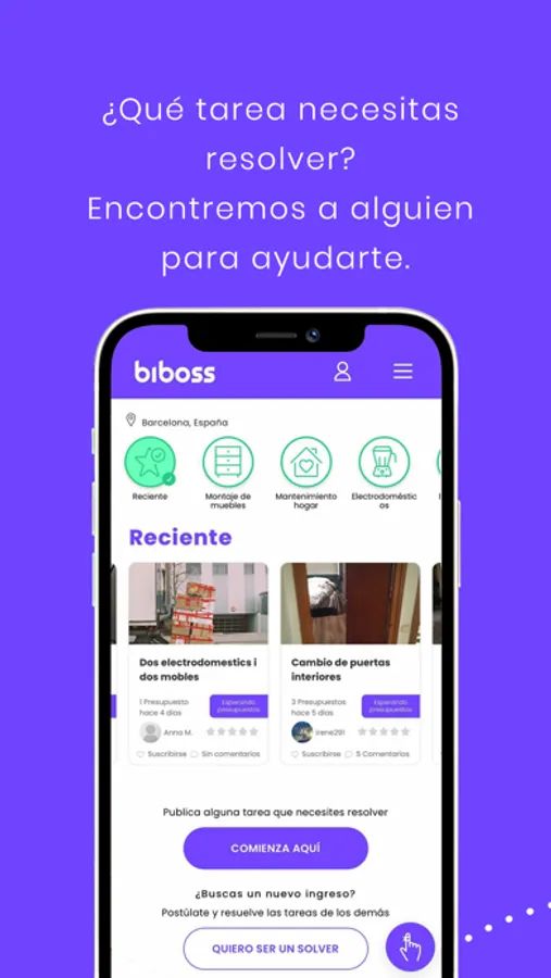Publica tu tarea en Biboss y encuentra la persona indicada para realizarla. Los Solvers más calificados de Madrid, Barcelona y Valencia te enviarán presupuestos para que elijas la opción más conveniente.