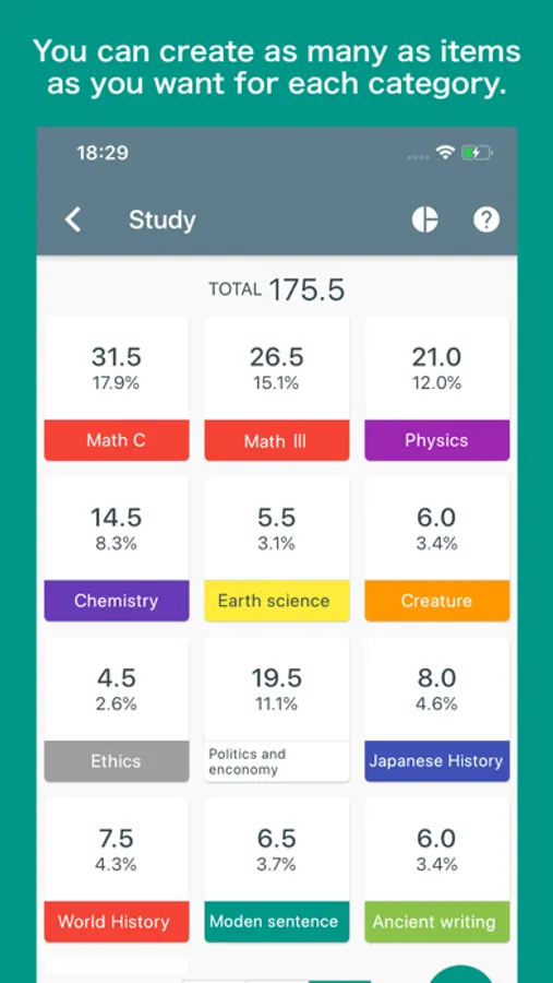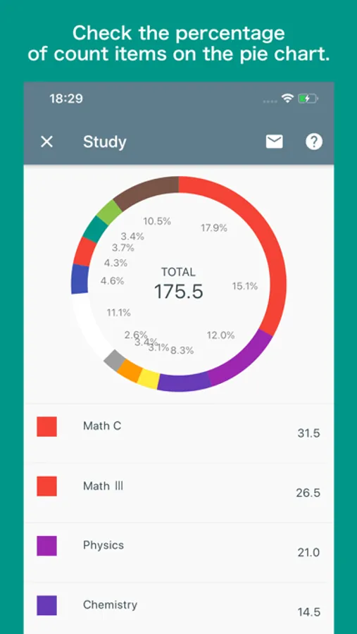 ・Total values are displayed for each category, each label or each color and percentages can be seen at a glance in the pie chart.