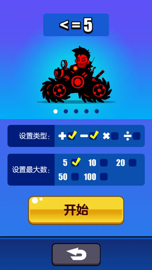 关卡设置:可以自定义设置加法、减法、乘法、除法,至少要选择一种运算类型
