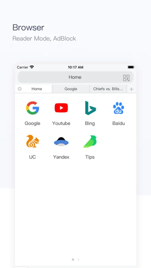 Reader mode/Adblock Plus/Multi-tab/Privacy Mode/Incognito Browsing/Long Webpage Clipping/No Image Mode/Search in Page/Generate QR Code/Custom UA/Save PDF/URL Association/Quickly Open and Copy URL/View image mode/Save images in batches/Custom search engine/Multilingual translation/Bookmarks/History/Developer tools, view web source code, Eruda and vConsole