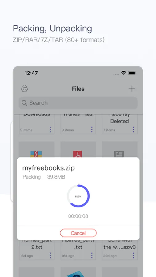 Support more than 80 compression formats such as ZIP, RAR, 7Z, TAR, LZH, XZ, ISO, CAB, WIM, ZIPX, JAR,AAR,LZFSE, etc.