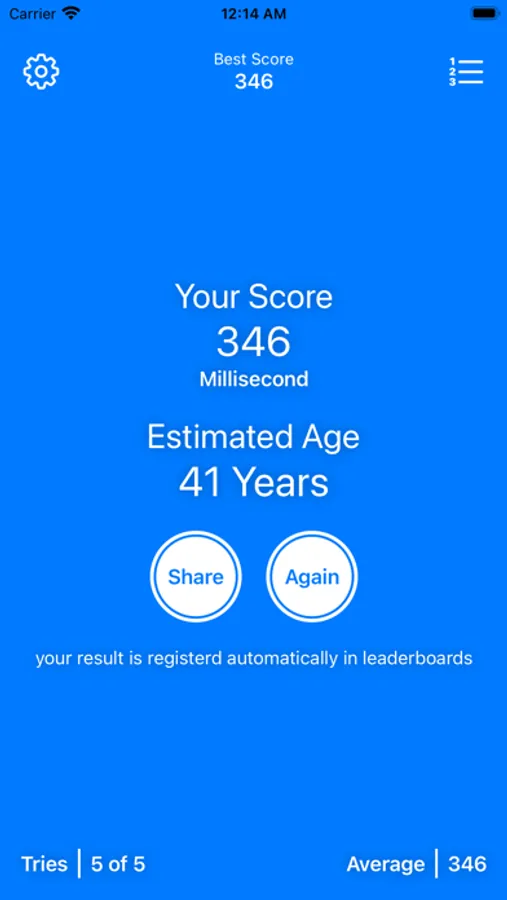 Test your reaction speed, the test is 5 stages then you get your result and your estimated age base on your reaction speed, you can compete in leaderboard and share result with your friends.