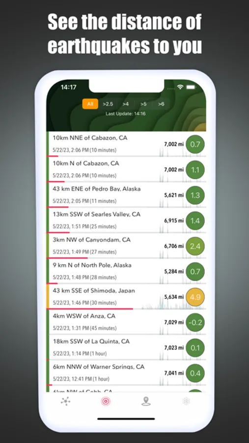- Detailed information on each earthquake, including distance, coordinates, magnitude, depth, and timing