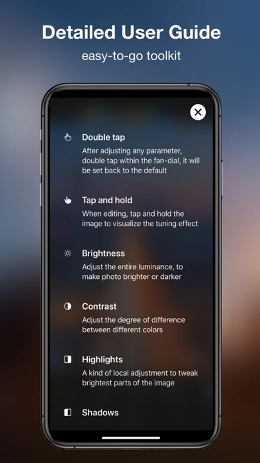 - Intuitive & Precise Experiences: Dial-tuning interface, tap to visualise the effect, swipe to pick another photo etc.