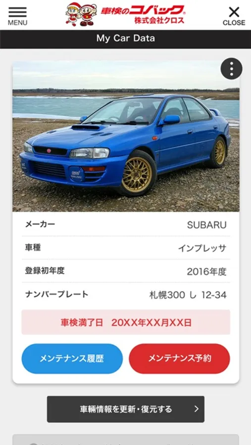 一度店舗へご来店いただきお車の登録がある場合、アプリに必要情報を入力していただくと、ご自身のお車の車検時期などがアプリ上でご確認いただけます!