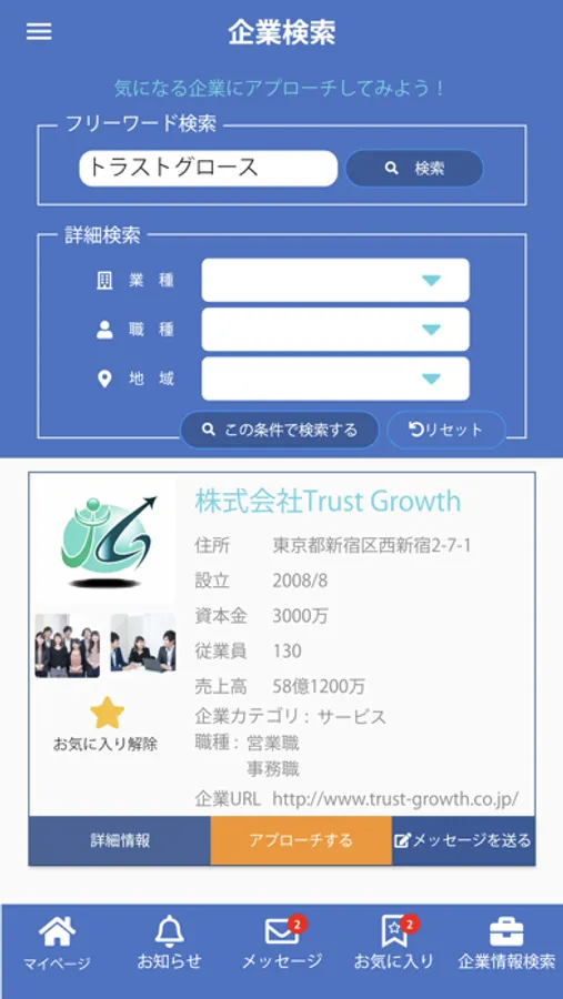 企業検索をして気になる企業にはアプローチすることができます。